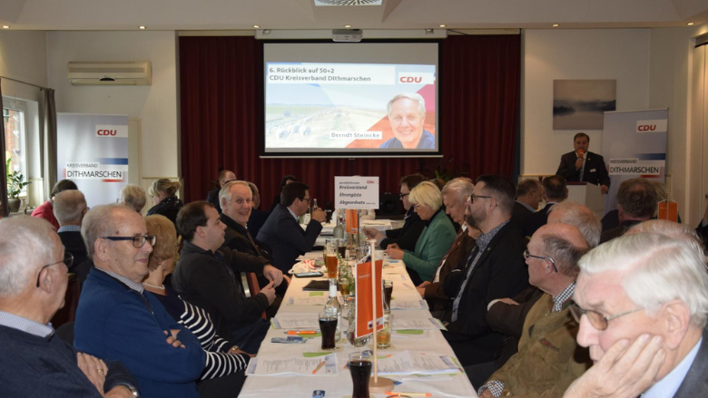 Lohe-Rickelshof – Mit zweijähriger Verspätung lud Kreisvorsitzender Volker Nielsen zum Jubiläums-Kreisparteitag ein. Im „Dörpshus“ in Lohe-Rickelshof konnte er neben über 80 Mitgliedern auch die Bundestagsabgeordneten Astrid Damerow sowie Mark Helfrich, MdL Andreas Hein und Kreispräsidentin  Ute Borwieck-Dethlefs sowie ehemalige Landtagsabgeordnete und Kreispräsidenten, begrüßen.