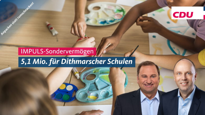 Einmal mehr untermauert unsere CDU-geführte Landesregierung, wie wichtig ihr die Infrastruktur und insbesondere die Schulen sind: „Die heute vom Bildungsministerium angekündigten 111 Mio. Euro aus dem IMPULS-Sondervermögen für Bau und Sanierung sind ein weiterer Meilenstein in der Behebung des Infrastrukturstaus an den Schulen“, so die Dithmarscher Landtagsabgeordneten Andreas Hein und Volker Nielsen. „Dabei freuen wir uns insbesondere darüber, dass auch Schulen in Dithmarschen gut dabei sind.“ Hein und Nielsen, am 8. Mai gerade erst mit 48,1 Prozent der Erststimmen und 47,37 als direkt gewählte Dithmarscher Abgeordnete bestätigt, verweisen auf mehr als 5,1 Mio. Euro, die nach Dithmarschen fließen.