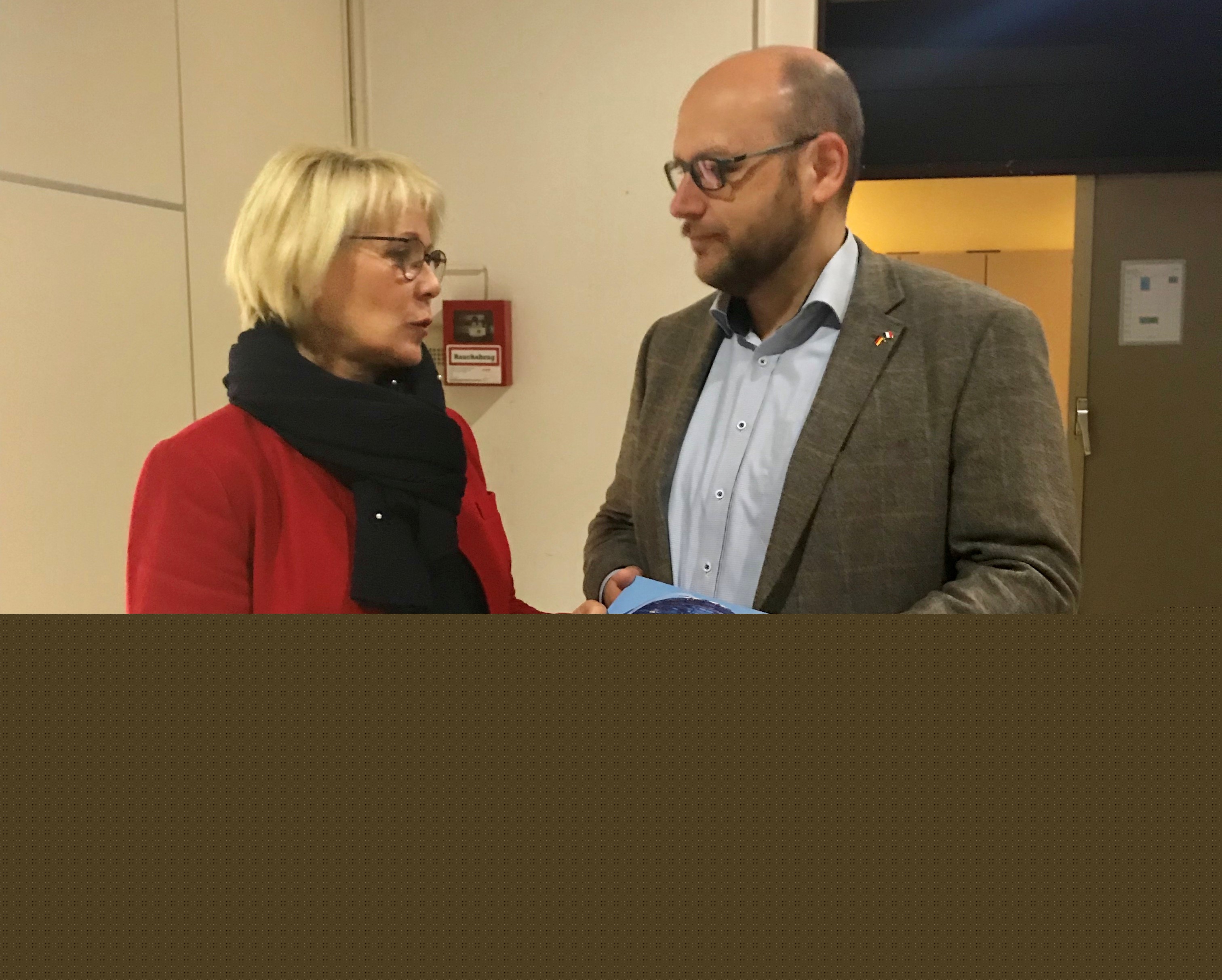...ich mich sehr freue, die Wanderausstellung des Deutschen Bundestages begrüßen zu können, die auf meine Initiative hin, hier in der Gemeinschaftsschule Heide-Ost zu Gast ist,. Sie ist bestimmt eine gute und abwechslungsreiche Ergänzung zum Politikunterricht“. Mit diesen Worten begrüßte die Bundestagsabgeordnete für Nordfriesland und Dithmarschen-Nord die Schülerinnen und Schüler der Klasse 10b der gastgebenden Gemeinschaftsschule in Heide und eröffnete damit die Ausstellung. Nicht jedoch, ohne zuvor dem Direktor Matthias Claussen für die zur Verfügungsstellung der Räumlichkeiten ganz herzlich zu danken und ihm ein Bildband über den Deutschen Bundestag für die Schulbibliothek zu überreichen.