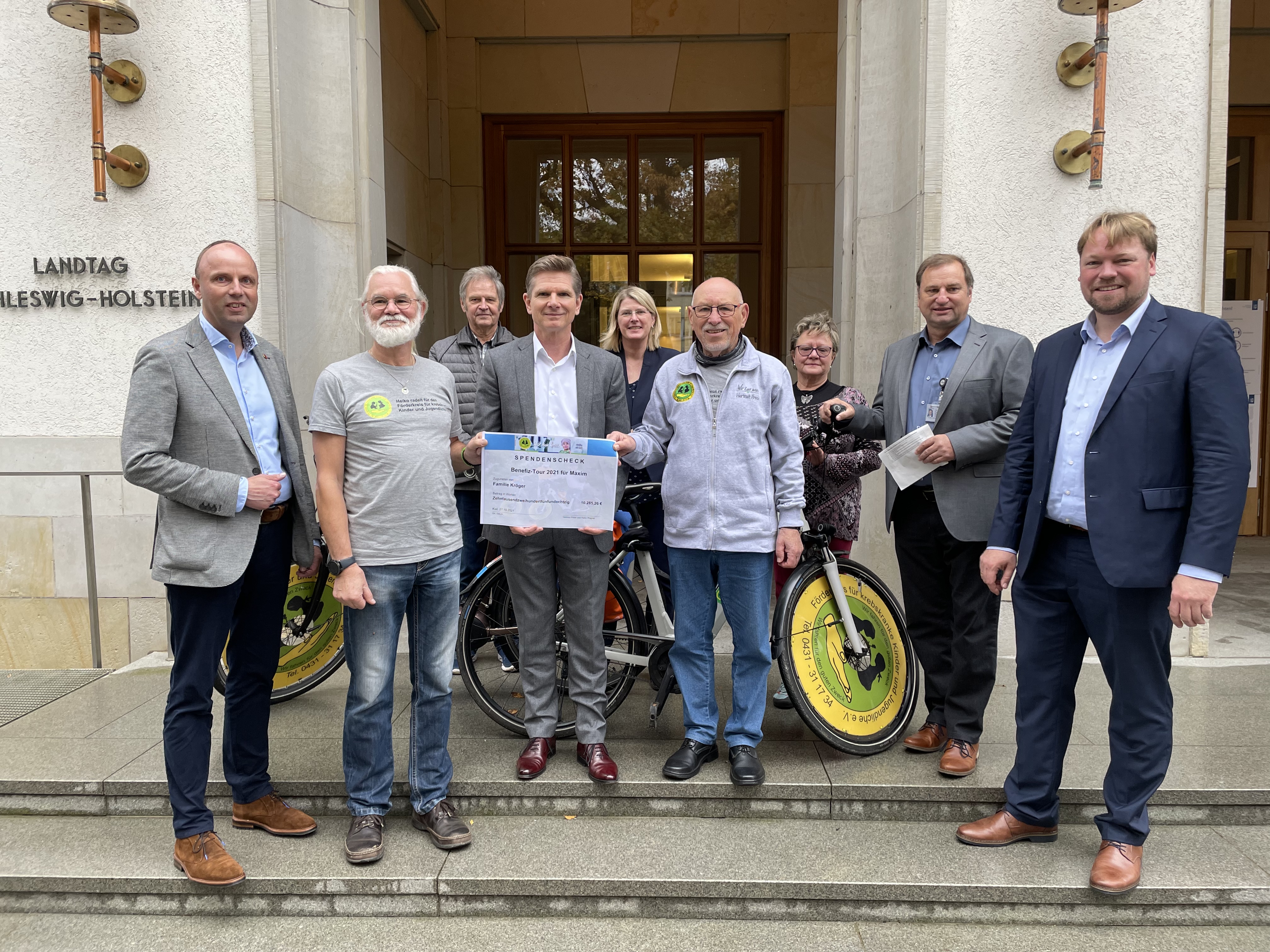 Heiko Wagner aus Stelle-Witthenwurth und Hartmut Prose aus Heide sind "gegen den Krebs" geradelt und haben auf Ihrer Benefiz-Fahrradtour unglaubliche 10.800 Euro an Spenden eingesammelt. Dieses Geld haben sie vor dem Landeshaus in Kiel dem Schirmherr des Förderkreises für krebskranke Kinder und Jugendliche e.V., Minister Dr. Heiner Garg, überreicht. Der Verein und wir Dithmarscher Landtagsabgeordneten freuen uns sehr über diese Spende und danken Heiko und Hartmut für diese tolle Aktion.