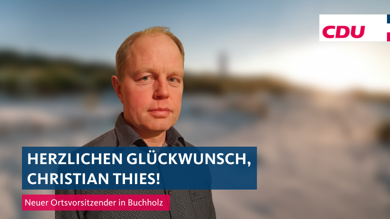 Auf der jüngsten Mitgliederversammlung im „Dithmarscher Hof“ wählten die CDU Mitglieder Christian Thies (49) zum neuen Ortsvorsitzenden. Vorgeschlagen wurde er von der vormaligen Vorsitzenden Merle Schmidt-Zulawski. Christian Thies ist ein "Buchholzer Jung" und Mitglied der Gemeindevertretung.