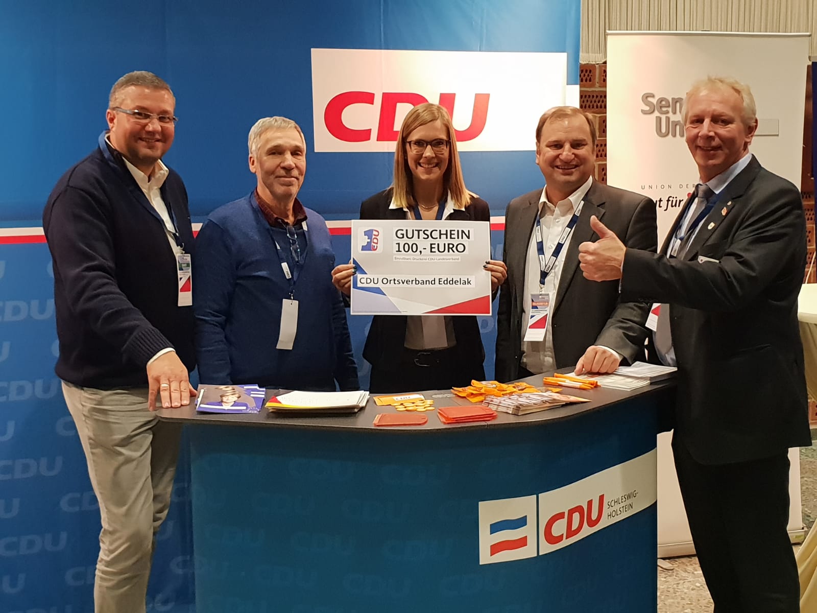Eddelak/Neumünster: Der CDU Ortsverband Eddelak hat durch seine intensive und erfolgreiche Mitgliederwerbung aus den Händen von CDU Landesvorsitzenden Daniel Günther einen Preis erhalten. Mitgliederbeauftragte Gesa Tank nahm den Scheck zur Unterstützung der Arbeit vor Ort während des Landesparteitages in Neumünster entgegen. Der Landesvorsitzende Daniel Günther sprach den Eddelaker Parteifreunden Lob für ihr aktives Engagement in der Gemeinde aus.