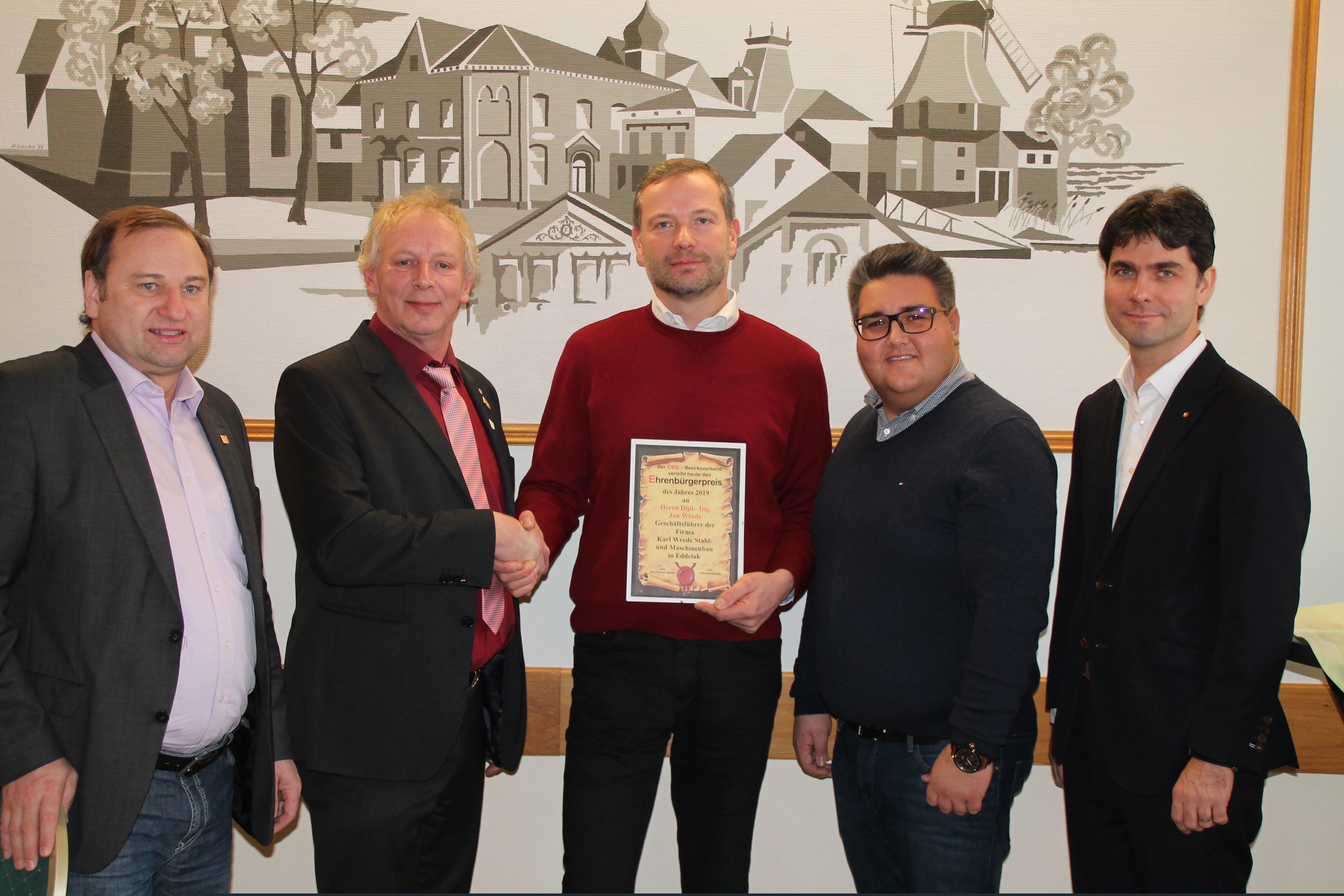 Höhepunkt des Neujahrempfangs war traditionell eine Bürgerehrung, die in diesem Jahr Jan Wrede, Inhaber der Firma „Karl Wrede, Stahl- und Maschinenbau“ aus Eddelak, galt. Seine Firma besteht bald 60 Jahre und begann als damals übliche Dorfschmiede. Durch ständige Neubauten und Erweiterung des Leistungsangebots entwickelte sich die Firma zum überregional tätigen Metallbauer. „Mein Vater Karl Wrede hatte sich aufgrund des Strukturwandels in der Landwirtschaft neue Kundenkreise erschlossen und ist mit den zusätzlichen Aufträgen gewachsen. Heute beschäftigen wir 40 Mitarbeitern und sind somit der größte Arbeitgeber vor Ort“, so der geschäftsführende Gesellschafter Jan Wrede. Die Schwerpunkte der Produktion liegen heute bei Konstruktion und Fertigung von Lastenaufnahme- oder Betriebsmitteln, Fertigung von Schweißkonstruktionen, Sonderkonstruktionen im Bereich des allgemeinen Anlagenbaus, Drehen, Fräsen, bis hin zur Großzerspanung. Die Brunsbüttler Industrie sowie die Windkraftbranche sind wichtige Auftraggeber. Der Region Dithmarschen fühlt sich Jan Wrede verbunden und so gilt das jährliche Engagement des Unternehmens auch dem sozialen Bereich. Mit Spenden an Vereine und Einrichtungen unterstützt die Firma soziale Aktivitäten und gesellschaftlichen Einsatz.