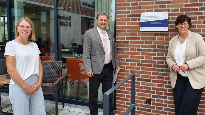 In vielen ländlichen Zentralorten Schleswig-Holsteins hat das Land den Bau von Multifunktionshäusern finanziell gefördert. So auch in St. Michel, der Brücke zwischen Marsch und Geest mit seinen rund 3.450 Einwohnern. Die Gemeinde erhielt für ihr „Schlüsselprojekt der Ortskernsanierung“ 750.000 € Zuschuss des Landes und der EU. Der 2020 bezogene Gebäudekomplex mit dem Namen „dat Donner Hus“ wurde von der Gemeinde mit Unterstützung eines hiesigen Architektenbüros geplant und gebaut. Zuvor war eine ehemalige Gaststätte erworben und abgerissen worden. „Mit Allgemeinarztpraxis, Ergotherapie, Tagesbetreuung, DRK Pflegedienst, Bäckerei und Café im Erdgeschoss und einer modernen Kindertagesstätte, sowie sieben barrierefreien Wohnungen im Obergeschoss sind eine Fülle von wichtigen Bestandteilen der örtlichen Daseinsvorsorge mitten im Dorf abgedeckt. Das multifunktionale Donner Hus ist im Land einzigartig. Ich bin sehr beeindruckt über den Mut und die Entschlossenheit der St. Michler Gemeindevertretung“, zeigt sich Innenministerin Sütterlin-Waack beeindruckt. Die Veränderungen in Ortsmitte sollen weitergehen. Bürgermeister Volker Nielsen (CDU) übergab der Ministerin im Rahmen des Ortstermins gleich einen Förderantrag für zwei weitere Bausteine der Ortsinnenentwicklung: Baustein 6 „Bahnhof und Umfeld“ sowie Baustein 7 „multifunktionale Nutzung Feuerwehrgerätehaus und Schaffung eines außen liegenden Treffpunktplatzes“. In beiden Bereichen gibt es derzeit städtebauliche Missstände.