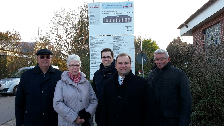 Fotos von links: CDU Fraktionschef Rolf Claussen, Hilke Eisenschmidt, Dr. Marten Waller, Landtagskandidat Volker Nielsen und Uwe Eisenschmidt vor der Baustelle des Schülerwohnheims am BBZ