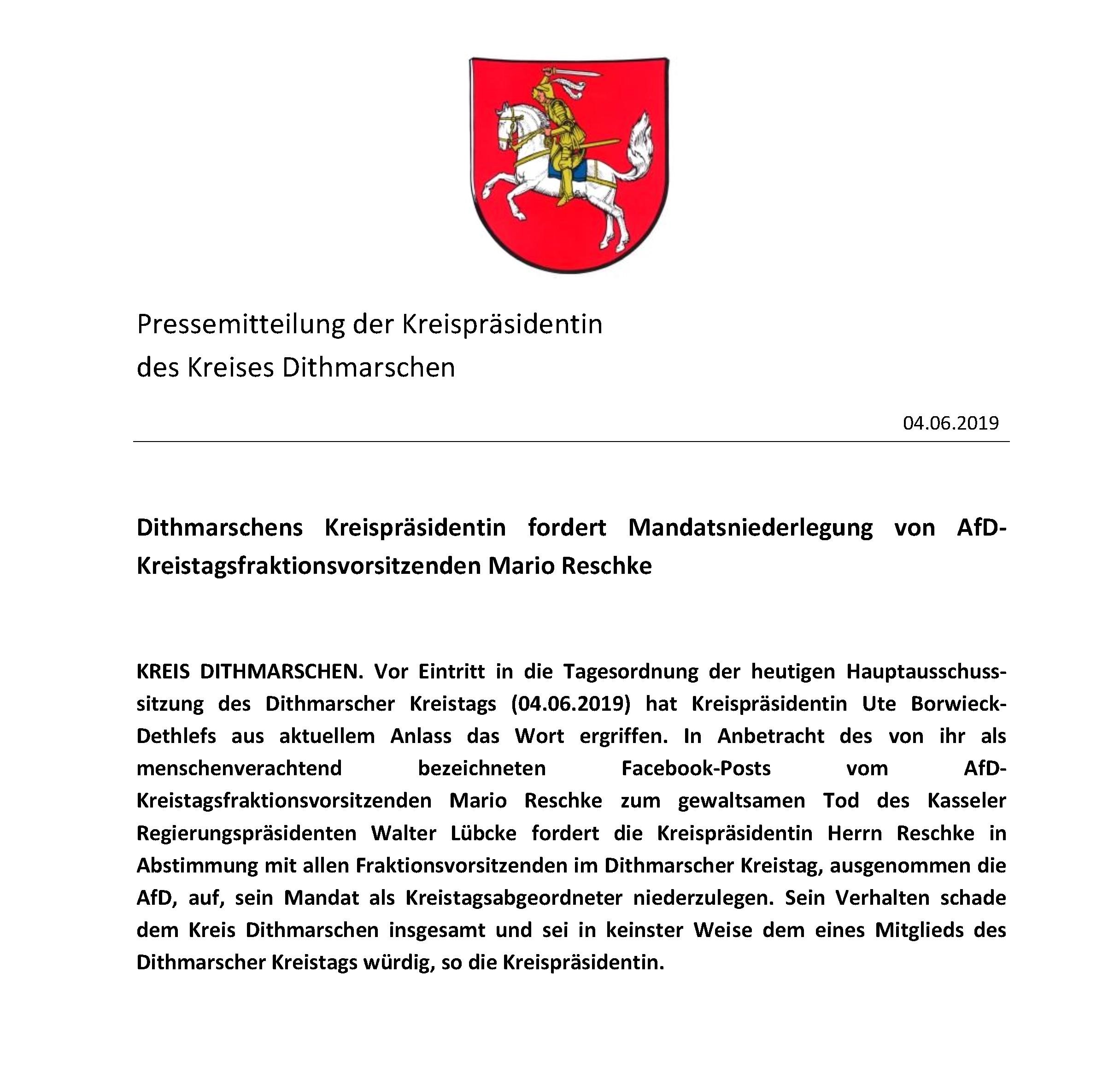 Was die AFD Dithmarschen und insbesondere Reschke sich mit ihrem FB-Post zum gewaltsamen Tod des Regierungspräsidenten von Kassel Walter Lübcke (CDU) geleistet hat, ist an Widerwärtigkeit nicht zu übertreffen.
