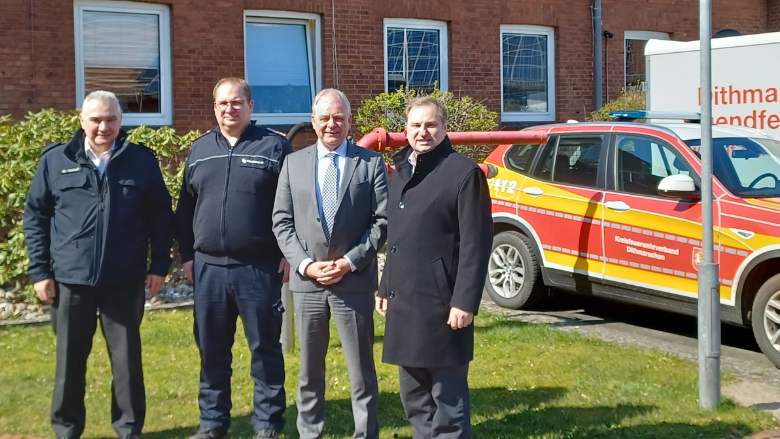 Dithmarschens Kreiswehrführer Martin Dreßler stellte dem Staatssekretär, dem Kieler Feuerwehr-Abteilungsleiter Dr. Kirchhoff und CDU Landtagsabgeordneten Volker Nielsen die Kreisfeuerwehrzentrale vor. Schulungsräume, Verwaltungstrakt, Übungs- und Werkstattbereiche stehen für die Betreuung der 90 ehrenamtlichen Wehren, den fünf Berufsfeuerwehren sowie den Wachabteilungen zur Verfügung. Künftig werden in dem Neubau an der B 5 südlich der Kreisstadt Heide Katastrophenschutz und die Feuerwehrzentrale an einem Ort sein.